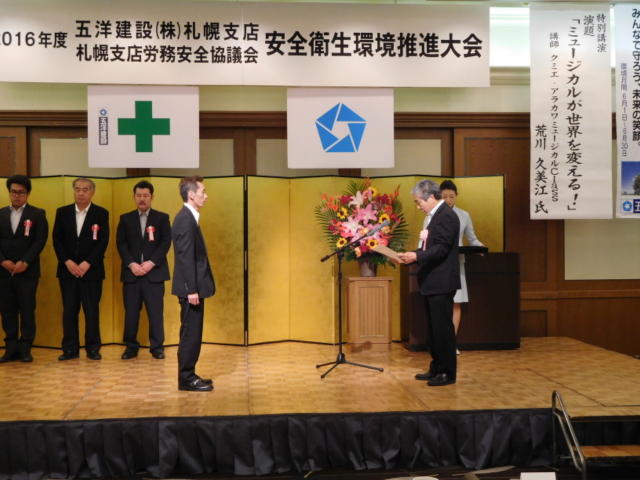 安全に功績があった会社・個人に表彰が行われ、個人の部で我社の笹井職長が安全表彰を