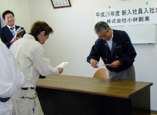 平成28年4月1日、今年も入社式を行う事が出来ました。塗装会社として毎年新卒者を